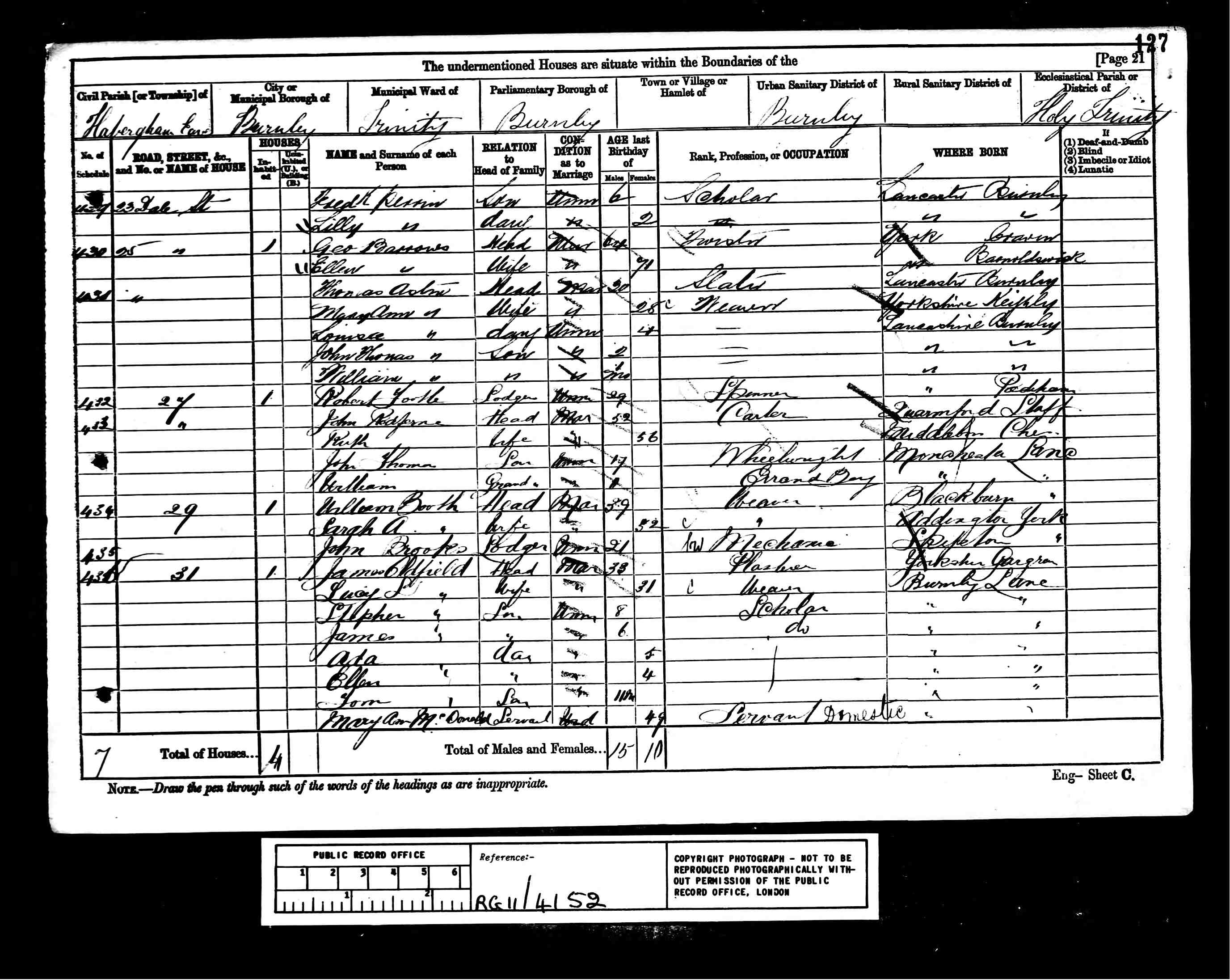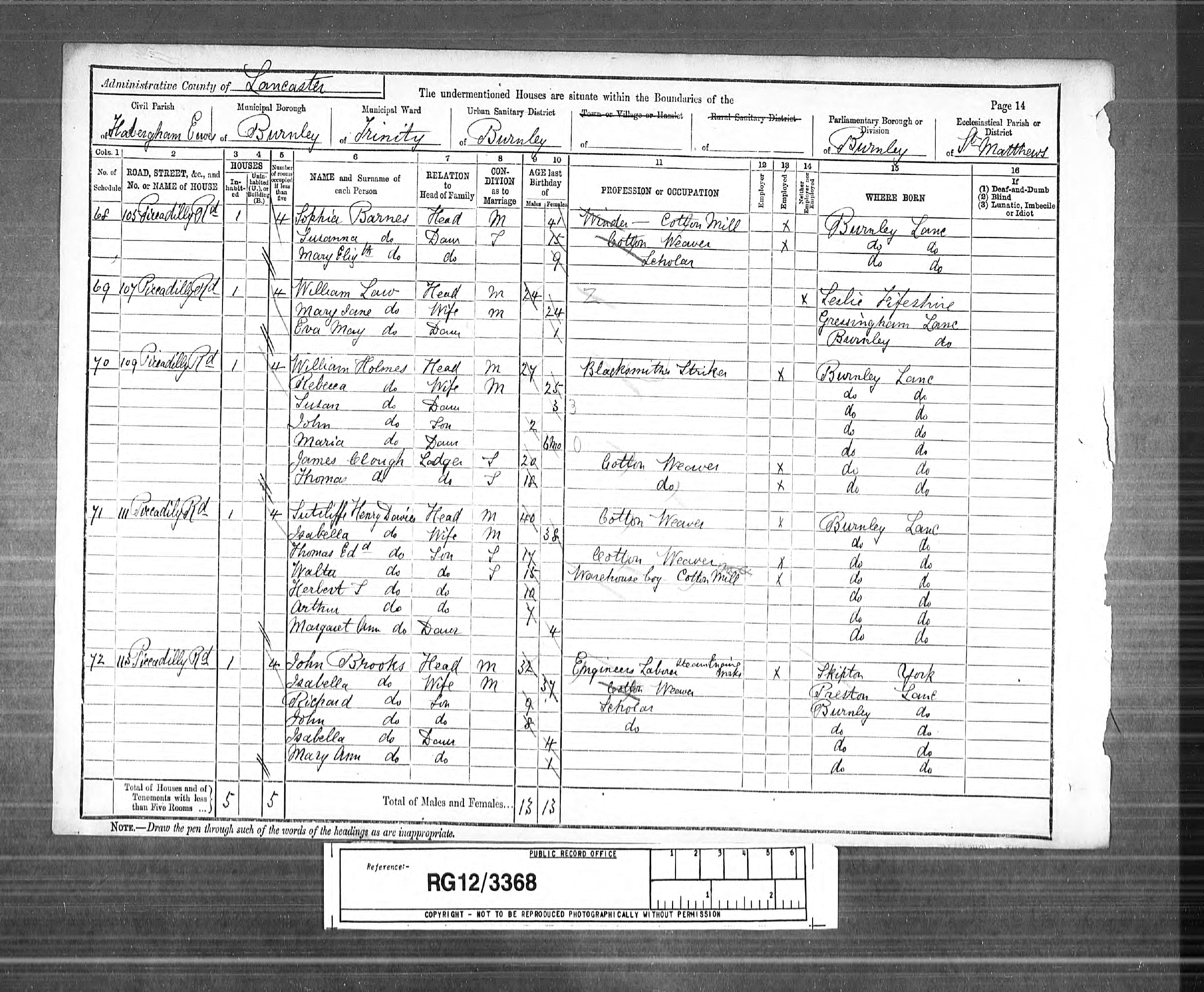 I found the Brooks line especially difficult to research, despite the fact that I found my Great-Grandfather, John Brooks in the 1881** and the 1901** UK Censi, so I knew he had been born in Skipton, Yorkshire in 1860. I also knew from his marriage certificate to my Great-Grandmother, Isabella Cartmell, that his father was also called John Brooks, who was recorded as being a Twister (this is an occupation in the cotton industry - see Occupations). I spent months of fruitless searching for any mention of John Brooks Senior and Junior prior to 1881. I attributed this to the fact that John Brooks was a common name, but I thought that I should have been able to find my Great-grandfather in the Free BMD (this is an amazing service that is a searchable database of Births, Marriages, and Deaths in the UK going back to 1837, the year civil registration started), but I had no luck. Up to this point I felt I had exhausted all the free resources available on the internet and I joined Ancestry.co.uk, a paid service that, at that time, offered access to the 1871, 1881, 1891, and 1901 Censi, as well as the same Births, Marriages, and Death information as Free BMD. I started looking for John Brooks in the 1871 Census, when he would have been aged 11. I found a John Brooks and his wife Ann, who had 2 sons and 2 daughters listed. Their names were Easter, John, and Richard Hall, and Sarah Ann Barns (listed as both daughter and a lodger). John Brooks Senior was listed as being a Twister. John Hall was recorded as being born in Skipton in 1860. The family was living in the Habergham Eaves district of Burnley. John Brooks 1871 Census - Image** There were so many correct threads here I decided this needed further investigation and went back to the 1881 Census**. At this point, John Brooks Junior was aged 21 and was living as a lodger with William and Sarah Booth at 29 Dale Street, Habergham Eaves. He was recorded as being John Brooks at this point, although he had been John Hall in the previous census 10 years earlier. Later that year, on November 27, he married Isabella Cartmell in the Holy Trinity Church, Habergham Eaves. |